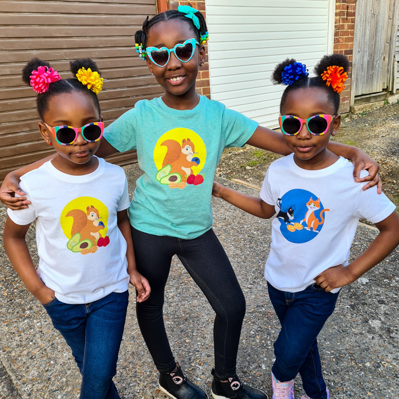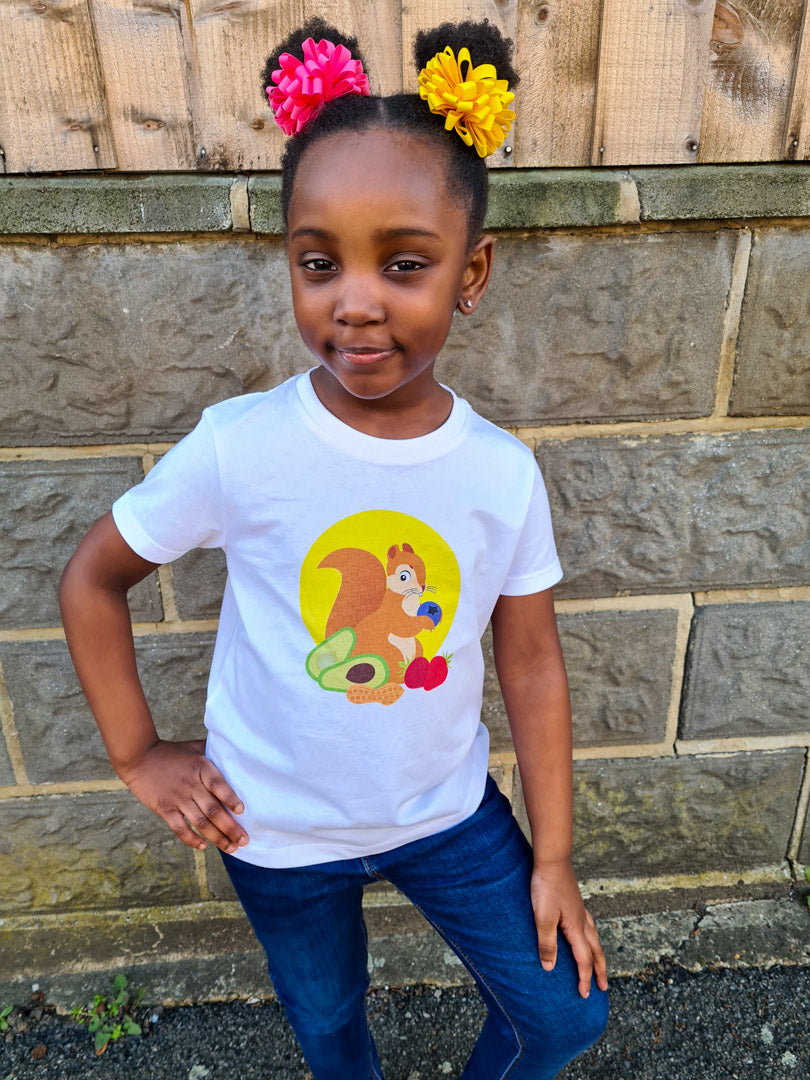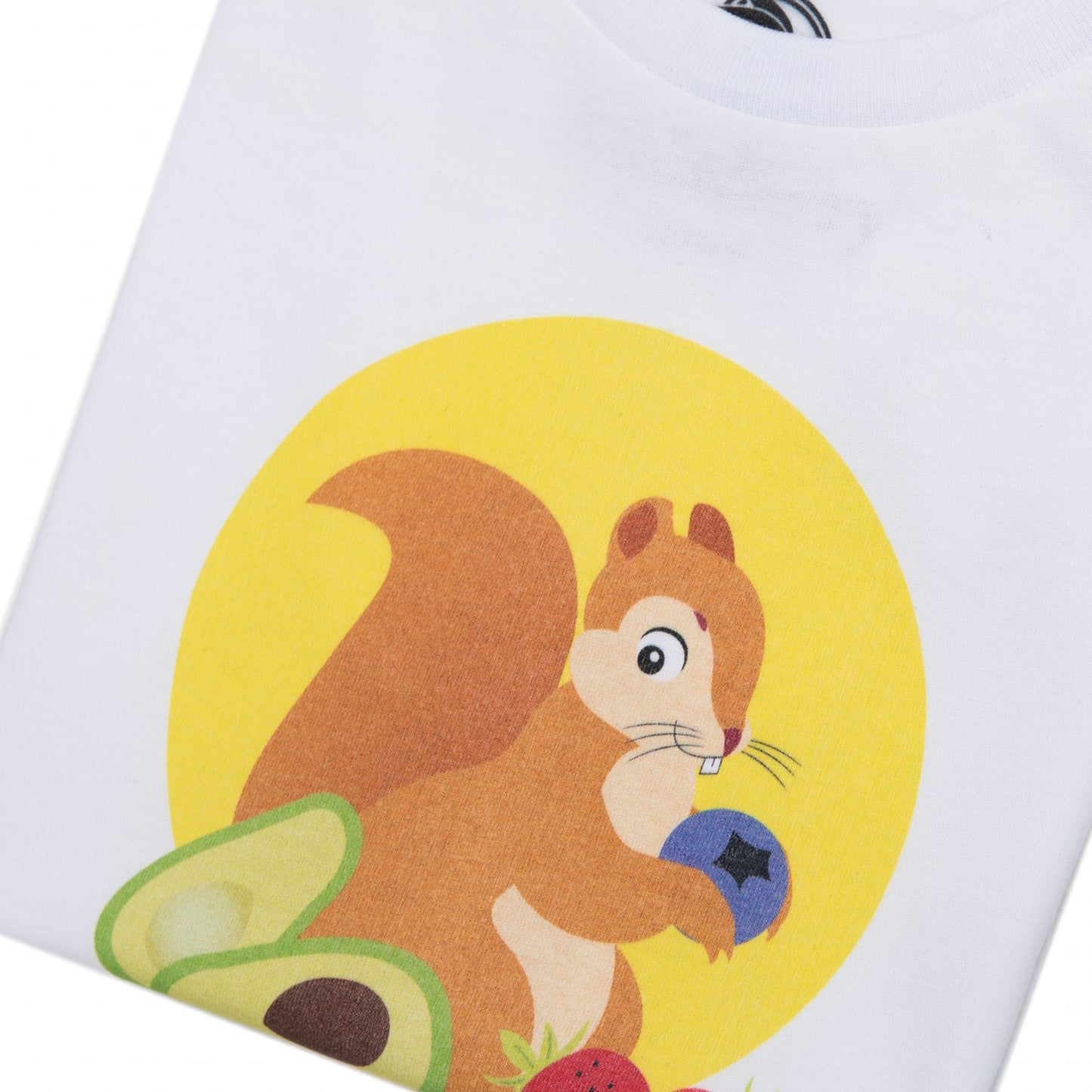 White shirt with a yellow circle at the centre featuring a brown squirrel holding a blueberry, surrounded by avocados, peanuts and strawberries.
