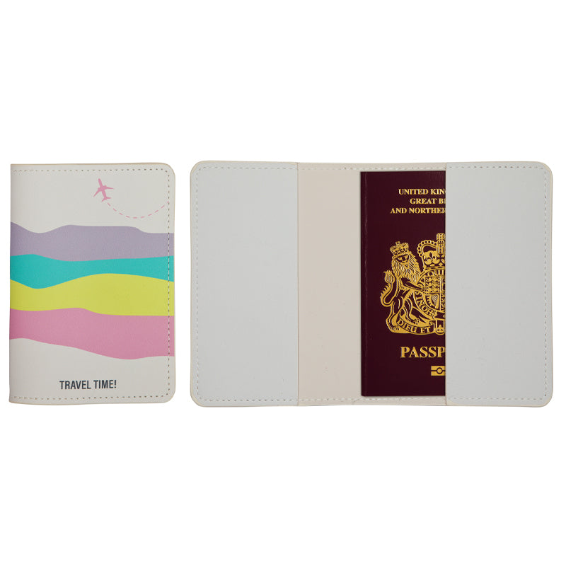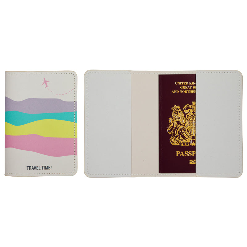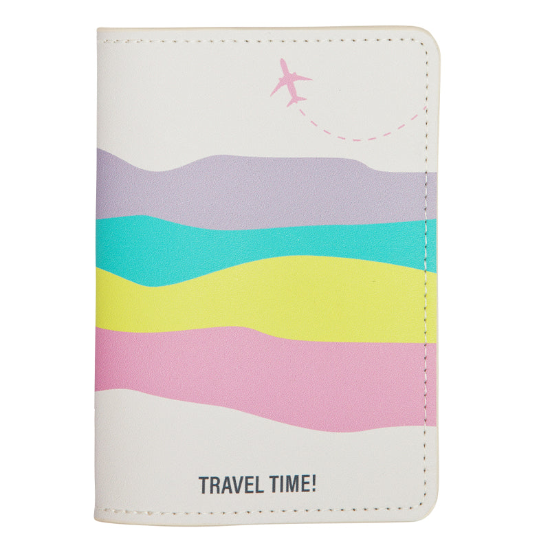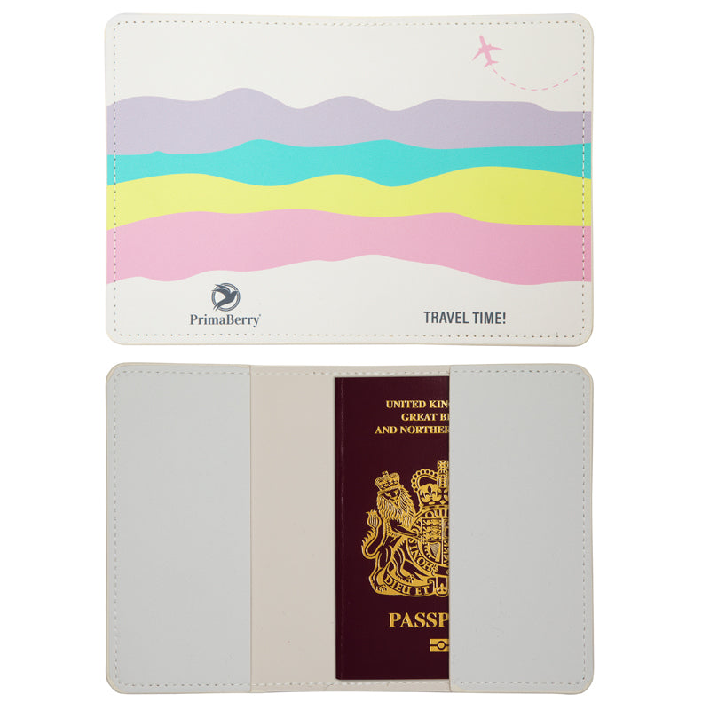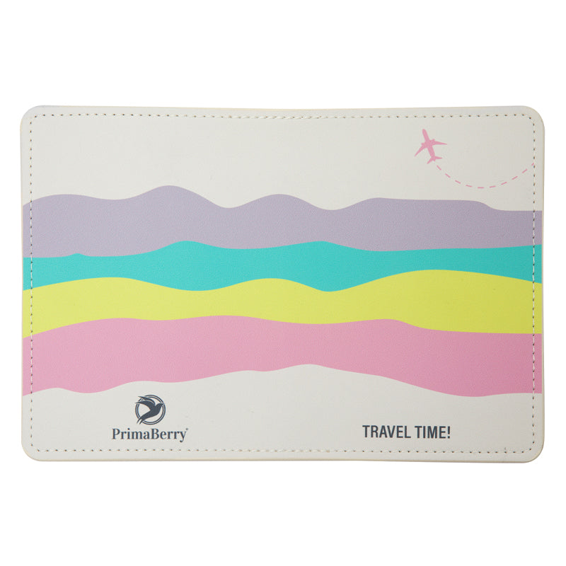 Both passport cover and luggage tag feature waves in pink, yellow, blue and purple with a small plane trail on the top, Travel Time! written at the bottom and the PrimaBerry’s logo in black at the back.