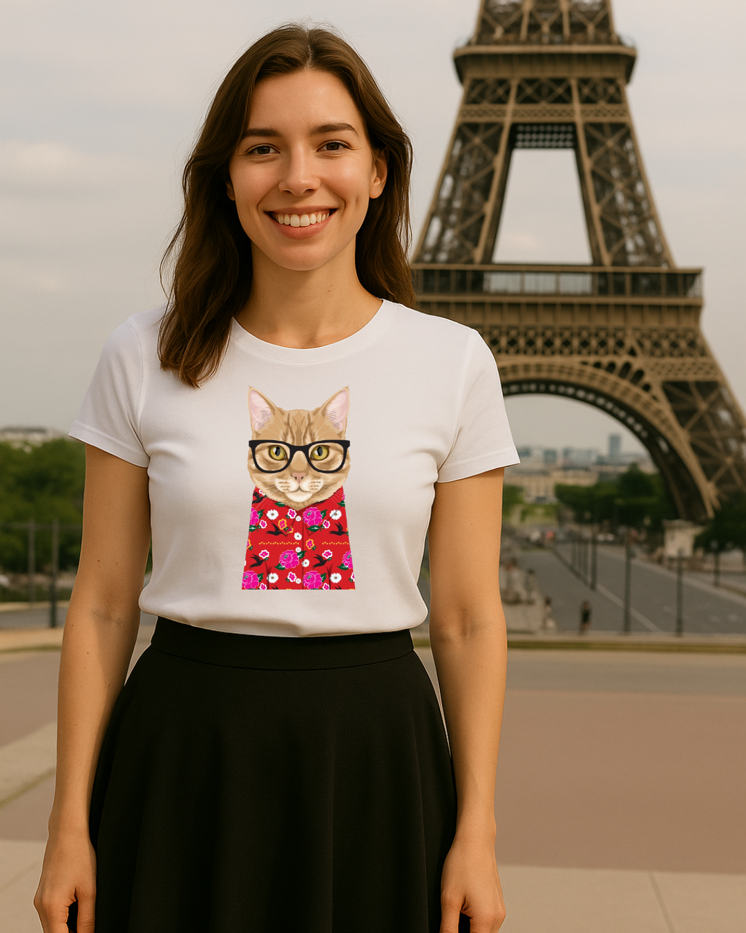 Silky white t-shirt featuring an orange cat wearing modern black-rim glasses and a traditional Portuguese Viana outfit consisting of a flower print on a crimson background.