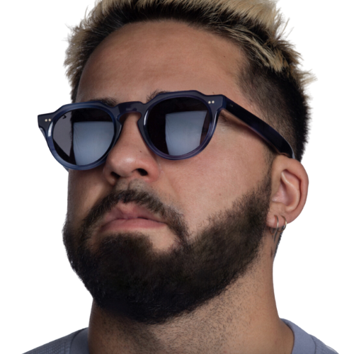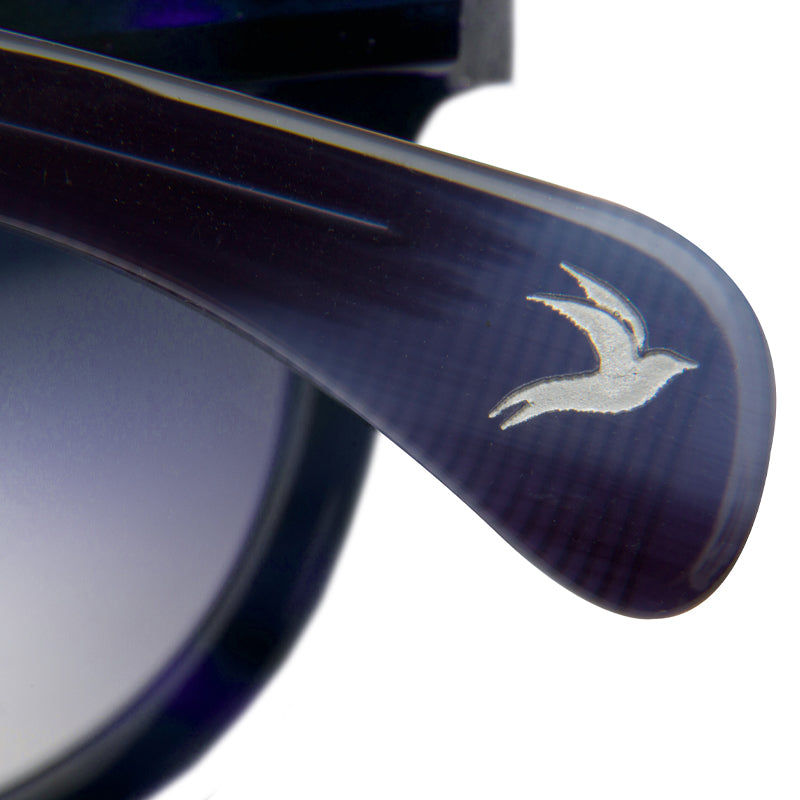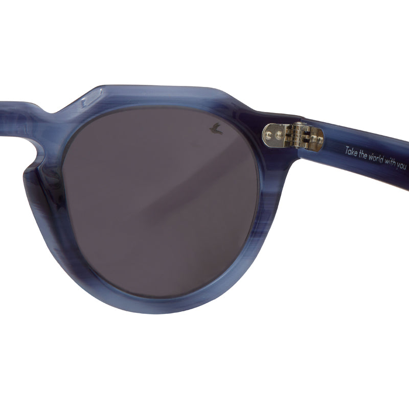 Óculos de sol redondos em azul com uma andorinha gravada no exterior na zona das têmporas e o seguinte texto no interior da moldura: Leve o Mundo Contigo. Autêntico feito à mão na Itália.